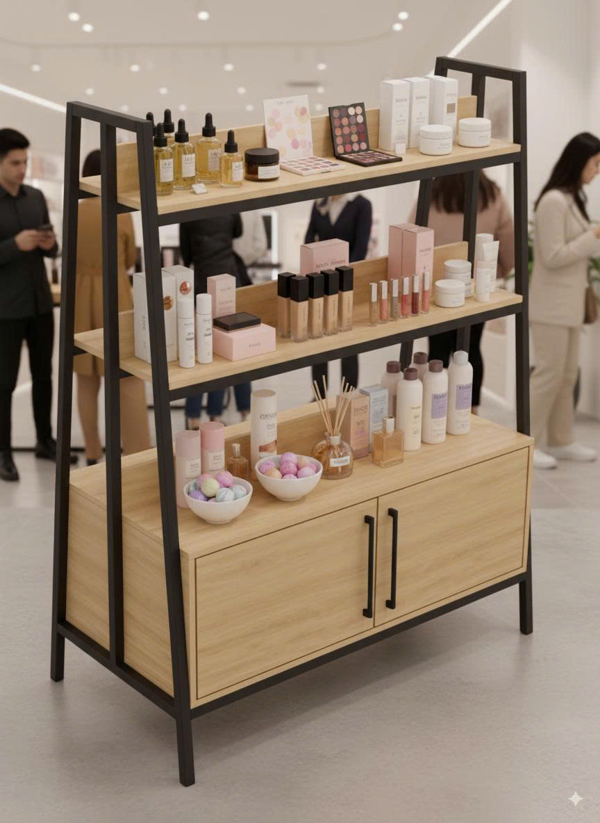 - Các tầng kệ gỗ: Tầng mâm được làm từ gỗ, dùng để trưng bày các sản phẩm mỹ phẩm và vật dụng trang trí.