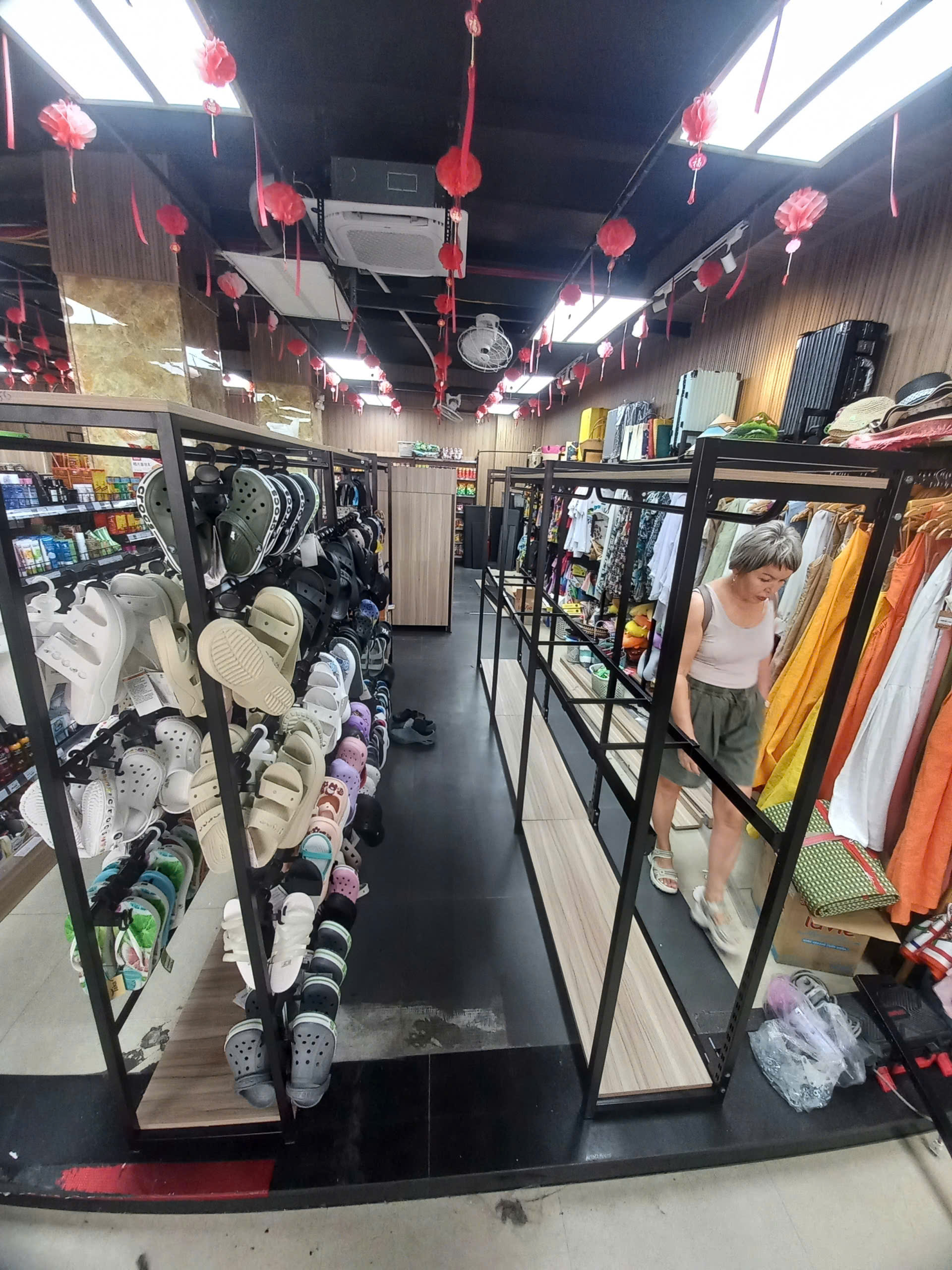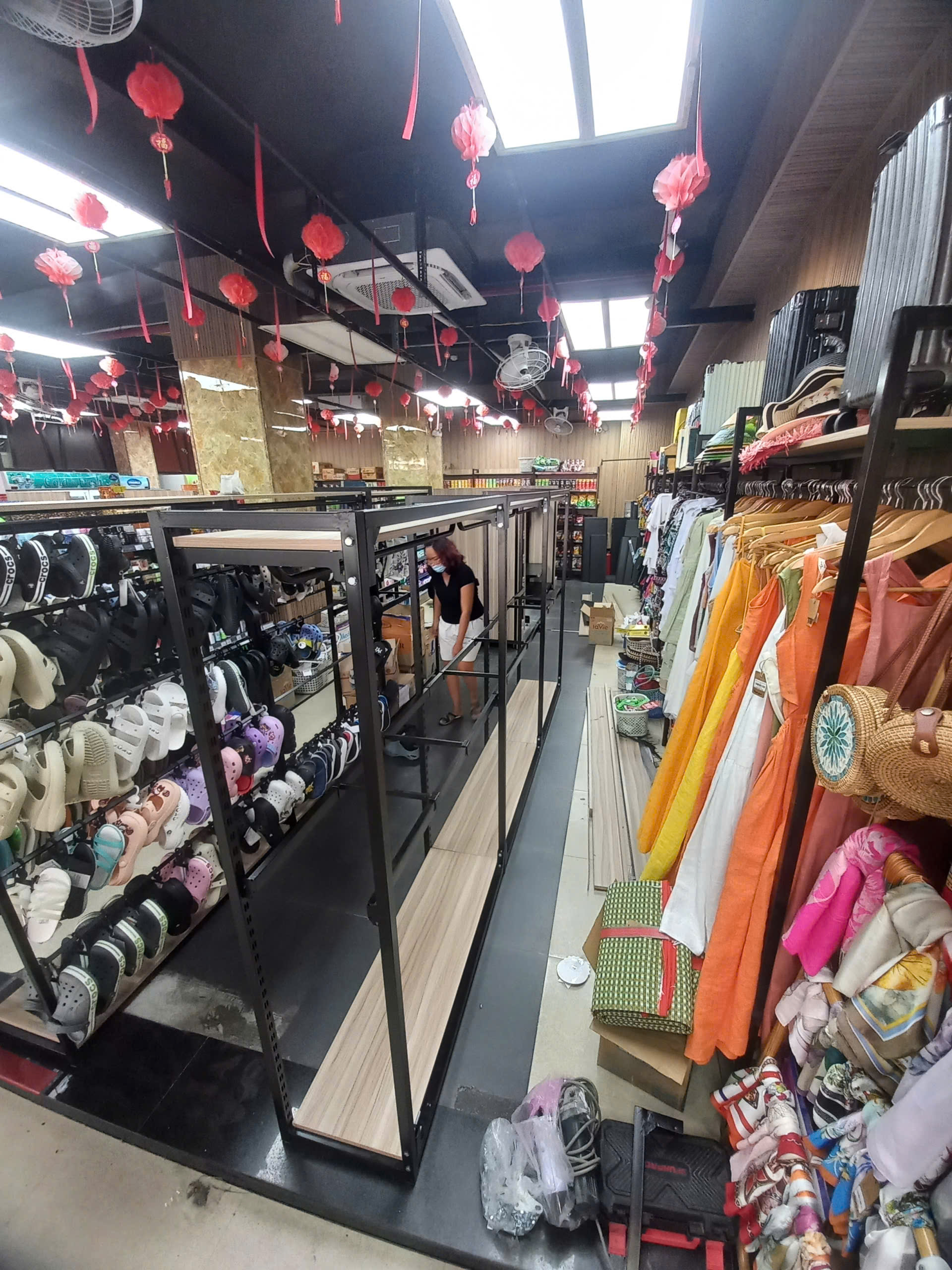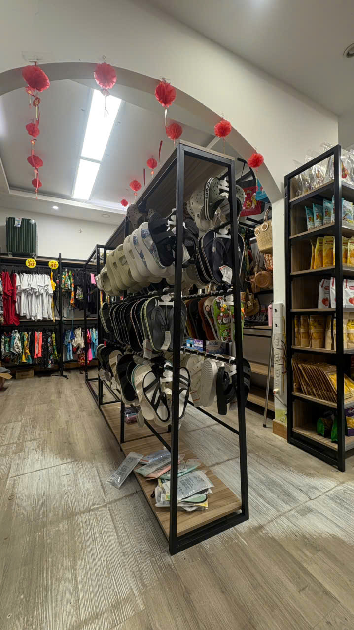 - Khung kệ: Được làm từ khung sắt kết hợp gỗ, có móc treo giữa các tầng